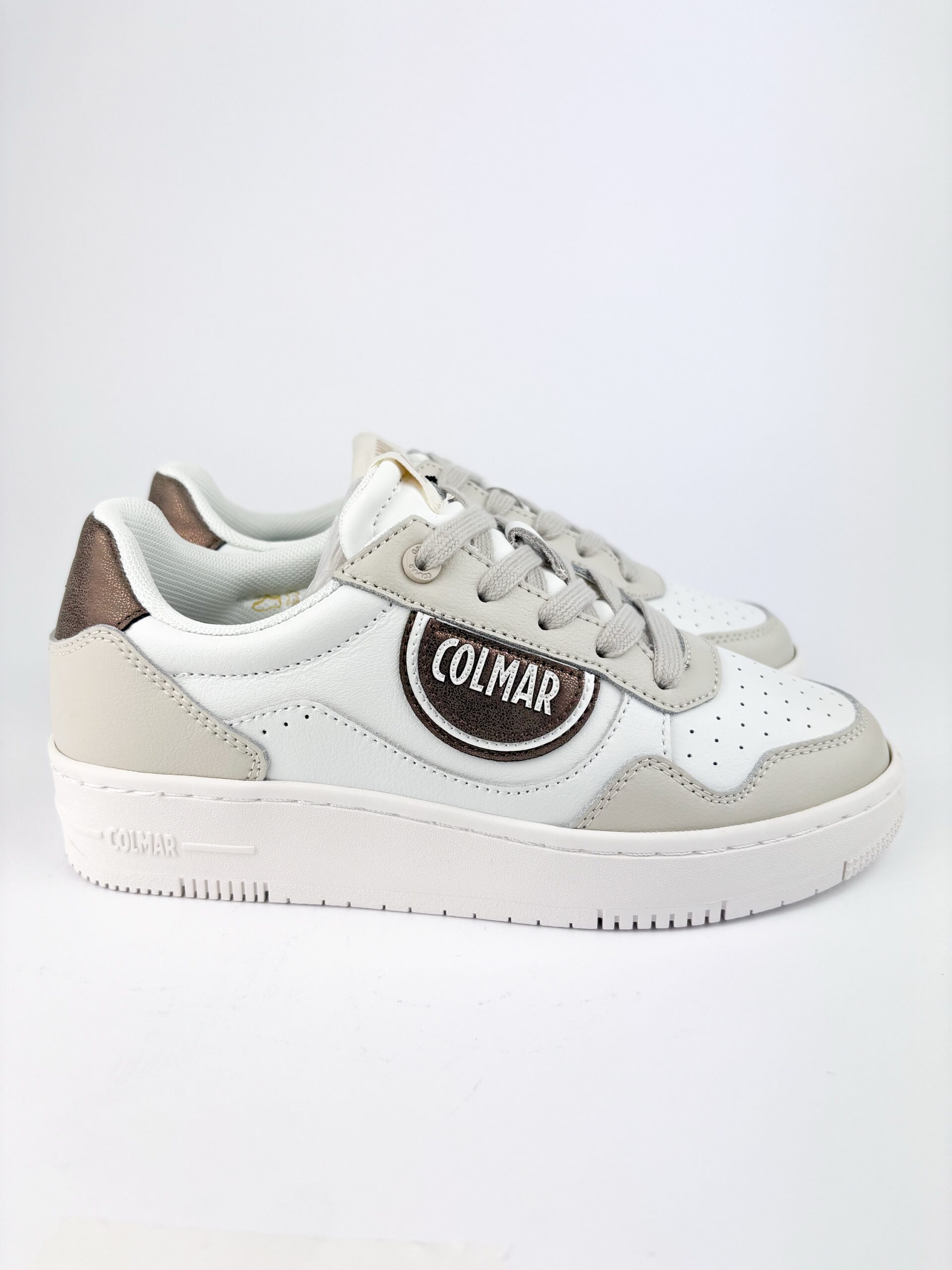 Colore: Bianca Beige con Dettagli Bronzo Materiale: Pelle e Poliestere Suola: 3 cm Soletta: Estraibile Calzara: Regolare